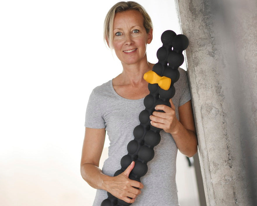 Der SPINEFITTER by SISSEL ist ein vielseitig einsetzbares Trainingsgerät bei Rückenschmerzen, Verspannungen in der Muskulatur und eingeschränkter Beweglichkeit der Facettengelenke. 28 miteinander verbundene Bälle liegen zweireihig entlang der Wirbelsäule. Die kleinen Bälle helfen durch den tiefenwirksamen Druck Verspannungen zu lösen.